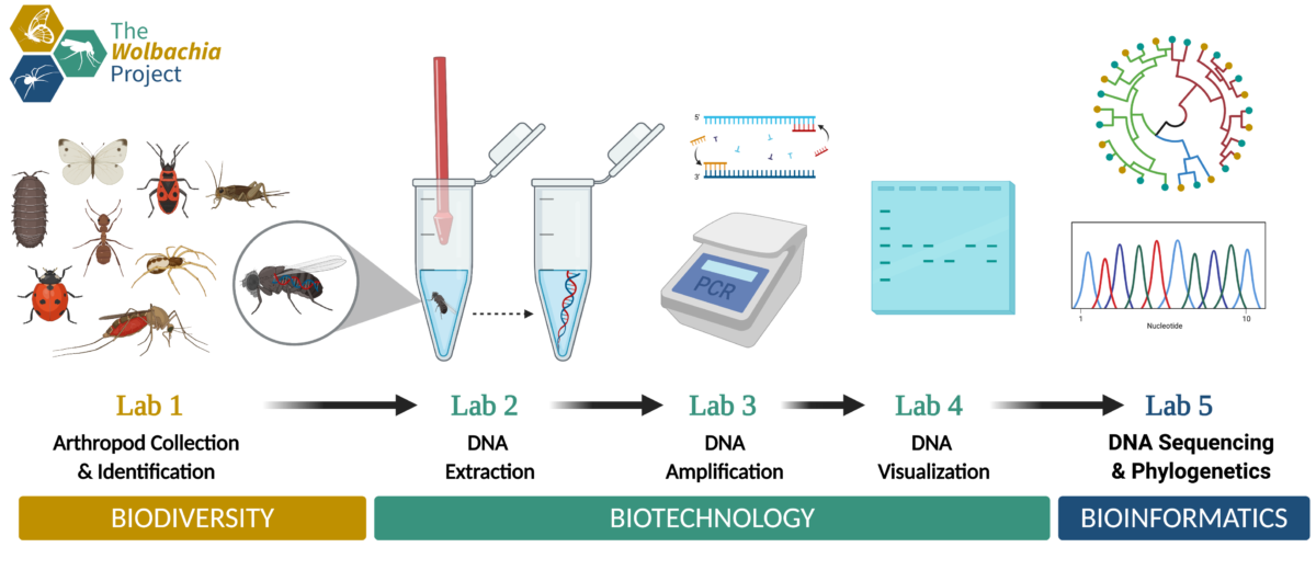 Discover the Microbes Within! The Wolbachia Project empowers biology educators to bring real-world scientific research into the classroom with inquiry, discovery, biotechnology, and a culture of excellence. Teachers and students will engage in hands-on research and contribute to the collection of scientific data within the Wolbachia research community. Through this immersive lab series, students will discover arthropod species in their local community; obtain DNA sequences of potentially new genetic strains of Wolbachia; and determine the evolutionary relatedness of these Wolbachia strains to other sequences published by scientists in the NCBI national genetic database.